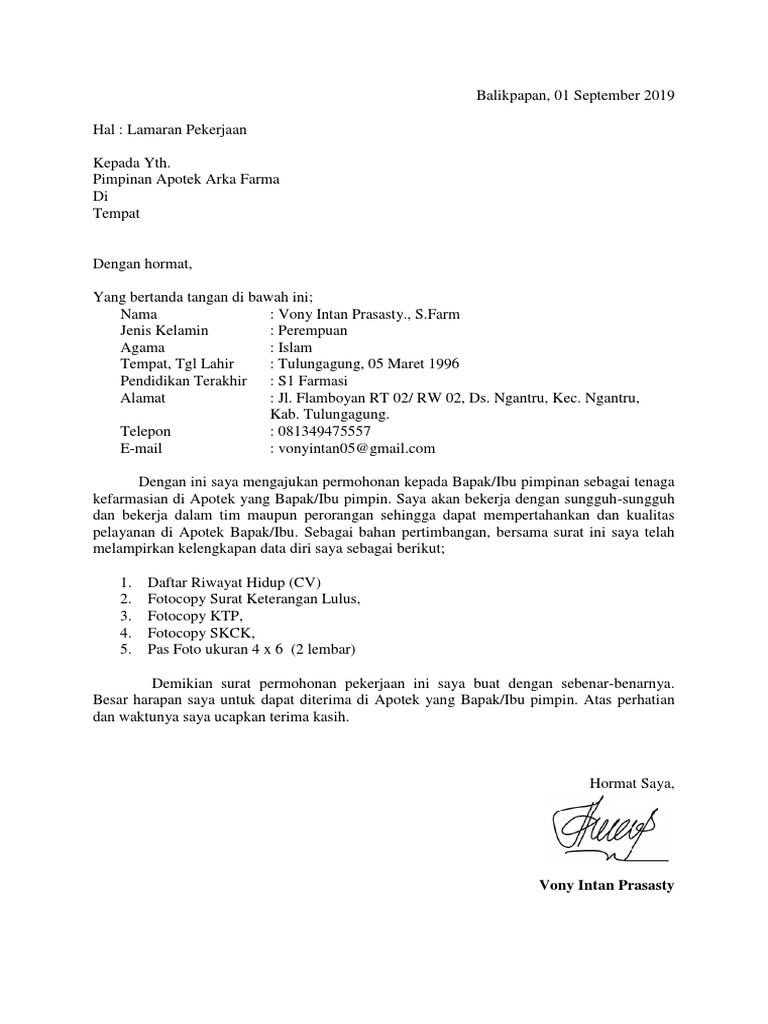 Saya sudah memiliki pengalaman magang kerja sebagai resepsionis di hotel hyatt medan. Surat lamaran yang menarik akan memberi peluang yang lebih besar untuk mendapat perhatian bagi para pimpinan perusahaan pencari kerja, sehingga peluang untuk dipanggil sesi wawancara sangatlah besar. Contoh surat lamaran kerja umum, bank, karyawan, alfamart, pt, sekolahan, formal, fresh graduate, bahasa inggris, via email, tulis surat lamaran kerja adalah surat yang digunakan untuk melakukan permohonan mendapatkan pekerjaan sesuai pengalaman pada perusahaan tertentu. Contoh surat lamaran apotek ini digunakan untuk melamar pekerjaan menjadi seorang karyawan atau pegawai di apotek dan merupakan contoh surat yang baik dan. Dengan hormat, melalui surat ini saya berniat mengajukan lamaran pekerjaan untuk posisi asisten apoteker di apotek senopati.