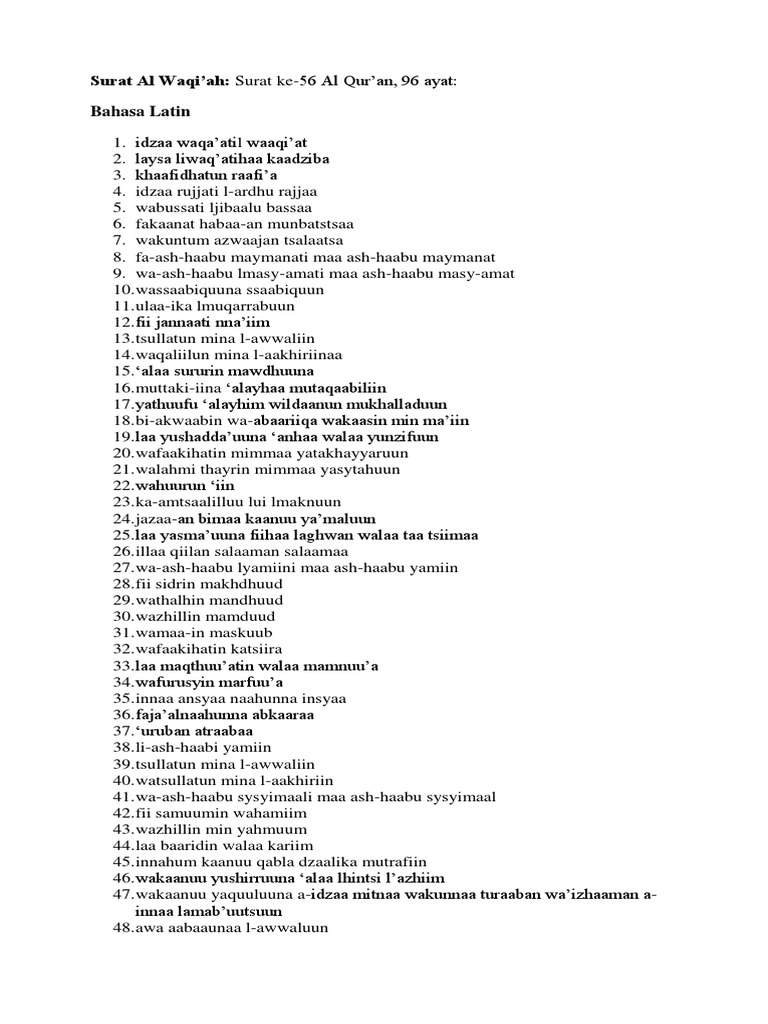Surat Al Waqiah Latin - Bacaan Surat Al Waqiah Latin Arab Dan Terjemahannya Muslim Fiqih Qur An Quran Surat - Surat al waqiah mempunyai 96 ayat yang memiliki banyak makna atau arti.. Surat al waqiah merupakan salah satu surat istimewa yang memiliki beberapa keutamaan seperti menghindarkan diri dari sifat lupa serta. Baca surat al waqiah bahasa arab dan latin dan juga terjemahnya. Surat al waqiah menjadi surat yang paling sering dibaca oleh rasulullah saw. Surat al waqi'ah diturunkan sesudah surat thaa haa. Baca surat al waqi'ah lengkap bacaan arab, latin & terjemah indonesia.