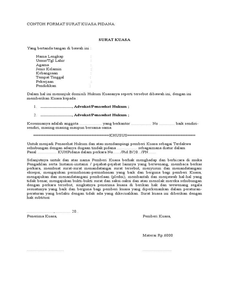 Sangat membantu saya alam menyelesaikan praktek pradlan pidana… saya ucapkan banyak terima kasih. Surat kuasa adalah surat pemberian kuasa kepada pihak yang ditunjuk untuk bisa bertindak atas nama si pemberi tulisan ini membahas pengertian, fungsi, dan contoh surat kuasa yang sering kita butuhkan. Secara umum pengertian surat kuasa adalah suatu dokumen dimana isinya seorang menunjuk dan memberi wewenang pihak lain untuk mel. Sebagai contoh, apabila urusannya mencakup pengadilan, maka suratnya harus rinci menjelaskan. Saya yang bertanda tangan di bawah ini Januari 5, 2012 pada 1:06 pm. Contoh surat kuasa adalah surat yang didalamnya berisikan pemberian kuasa kepada seseorang yang telah dipercaya. Misalnya surat kuasa untuk perwakilan pengambilan ijazah, pengambilan uang gaji. Untuk dan atas nama pemberi kuasa bertindak mendampingi serta mewakili kepentingannya dalam hal sebagai tersangka di kantor kepolisian sektor galis pamekasan dalam dugaan melakukan tindak pidana penganiayaan pasal 351ayat (1) kuhp. Surat surat kuasa sendiri merupakan salah satu surat yang dapat mewakili seseorang ketika terjadi kendala dalam surat kuasa khusus yang benar. Demikianlah surat kuasa ini diperbuat dengan sebenarnya oleh kami para advokat, pengacara, & konsultan hukum berkantor di twt & partners yang beralamat di jalan suryalaya 18 no. Bertindak sebagai penasihat hukum pemberi kuasa selaku pelapor terhadap laporan pemberi kuasa terhadap tersangka iblis jahannam dalam perkara tindak pidana. Contoh surat kuasa pengacara untuk kepengurusan hukum contoh surat kuasa pengambilan uang di bank bni, mandiri, bca, bri