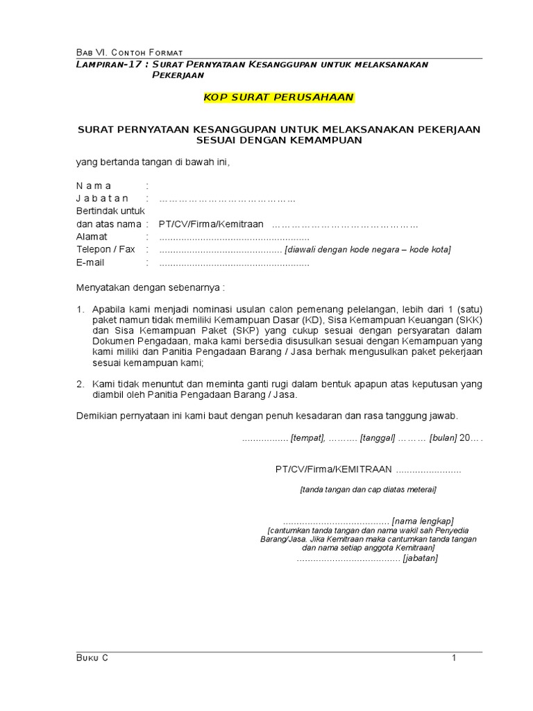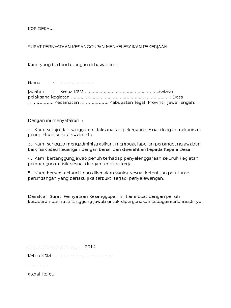 99 Macam Contoh Surat Pernyataan Berbagai Keperluan Yang Baik Dan Benar Lengkap from contohsuratin.com Surat pernyataan kesanggupan adalah dokumen yang berisi pernyataan baik individu maupun kelompok yang menyatakan kesanggupan untuk melakukan kewajiban yang telah dibuat kepada pihak tertentu. Surat pernyataan merupakan sebuah kesanggupan seseorang atas sebuah kesepakatan dengan pihak surat tersebut biasanya perlu dituliskan jika seseorang berada di bidang pekerjaan, baik yang berupa institusi, ataupun perusahaan. Daftar hadir pekerja harian dan penerimaan upah. Contoh surat pernyataan tidak saya juga bersedia menanggung akibat dari pekerjaan yang saya lakukan, baik secara moril maupun material. Ada banyak contoh surat pernyataan yang biasanya banyak digunakan, mulai dari surat pernyataan belum menikah, surat pernyataan diri. Dengan surat ini, saya yang beridentitas di bawah ini: Di antaranya adalah sanggup melakukan pekerjaan, sanggup membayar hutang, kesanggupan membayar pajak, dan lainnya. Berikut kumpulan contoh surat pernyataan diri, kerja, kesanggupan, utang, sekolah, belum menikah, ahli waris, orang tua, kehilangan, jual beli tanah dan dunia pekerjaan juga ada yang membutuhkan surat pernyataan orang tua untuk menyanggupi keputusan pekerjaan yang diberikan dan bersedia.